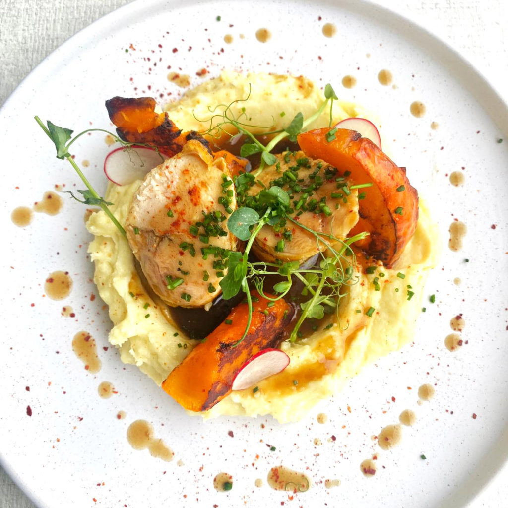 • Le suprême de volaille, une pièce tendre et juteuse accompagnée d’une purée de pommes de terre avec potimarron rôti.